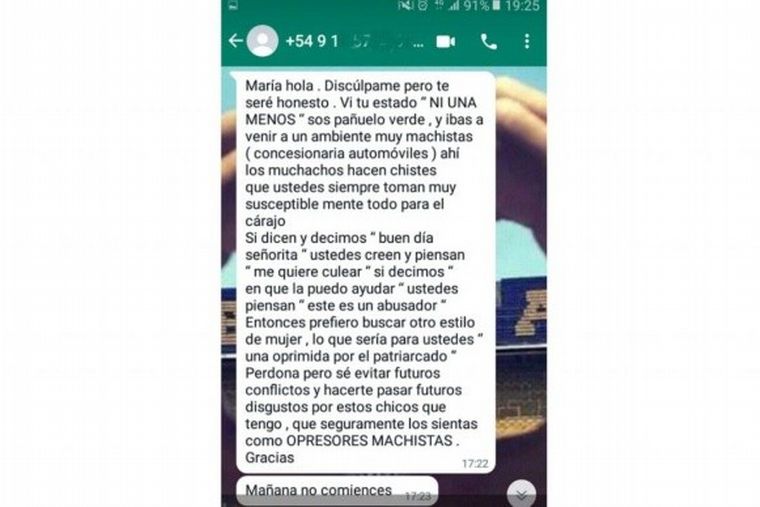El mensaje empezaba así: "María, hola. Disculpame pero te seré honesto. Vi tu estado 'Ni una menos', sos pañuelo verde e ibas a venir a un ambiente muy machista".