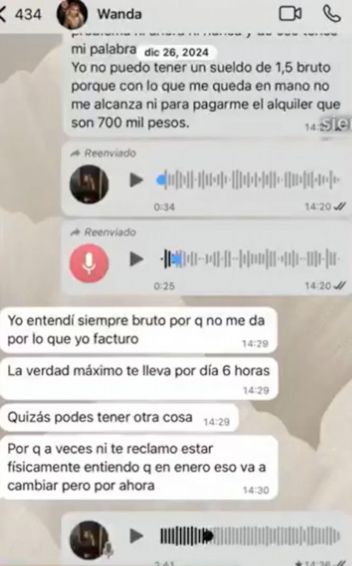 Durante una conversación le comentó a Wanda que no podía vivir con el sueldo bruto que le ofrecían. "Yo no puedo tener un sueldo de 1.5 bruto, porque con lo que me queda en mano no me alcanza ni para pagarme el alquiler", escribió la empleada. Wanda Nara, por su parte, respondió que había entendido que el sueldo era bruto y que la carga de trabajo no era tan alta. "La verdad, máximo, te lleva 6 horas por día", argumentó la conductora.