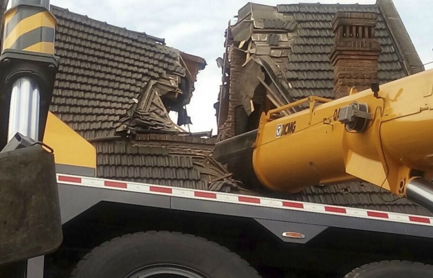 Según indicaron voceros policiales, la grúa perdió el centro de gravedad y volcó hacia un costado, por lo que apoyó el brazo en el techo de la casa.