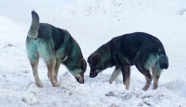 Según informaron, los canes se encontraban vagando afuera de una fábrica que producía plexiglás y ácido cianhídrico, por lo que los animales se tiñeron sin querer de ese tono al entrar en contacto con los productos químicos.