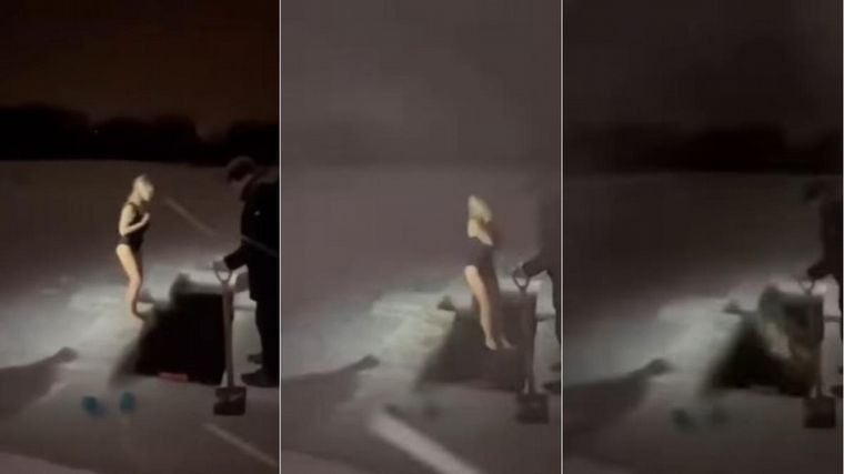 En las imágenes se ve como Ana Uskowa se lanza a un agujero de hielo frente a su marido, sus dos hijos y otros familiares. Con un traje de baño oscuro, se persignó, se tapó la nariz, se arrojó al agua y desapareció.