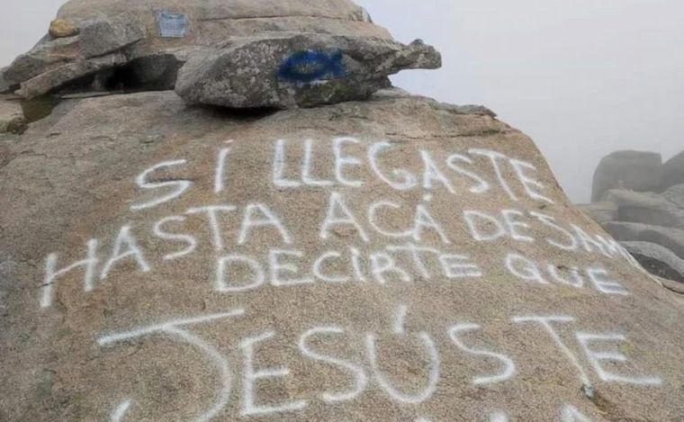 La Policía Ambiental realizará tareas de restauración y se buscan a los responsables. Las frases de contenido religioso fueron descubiertas por un grupo de guías y montañistas durante una excursión.