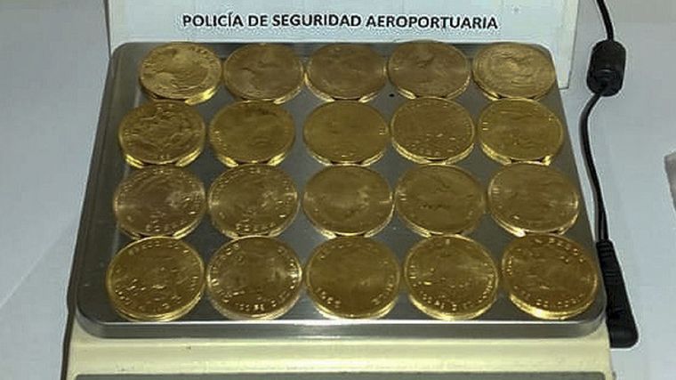 Por su parte, en la valija había otras 20 monedas de oro, informaron fuentes de la PSA.