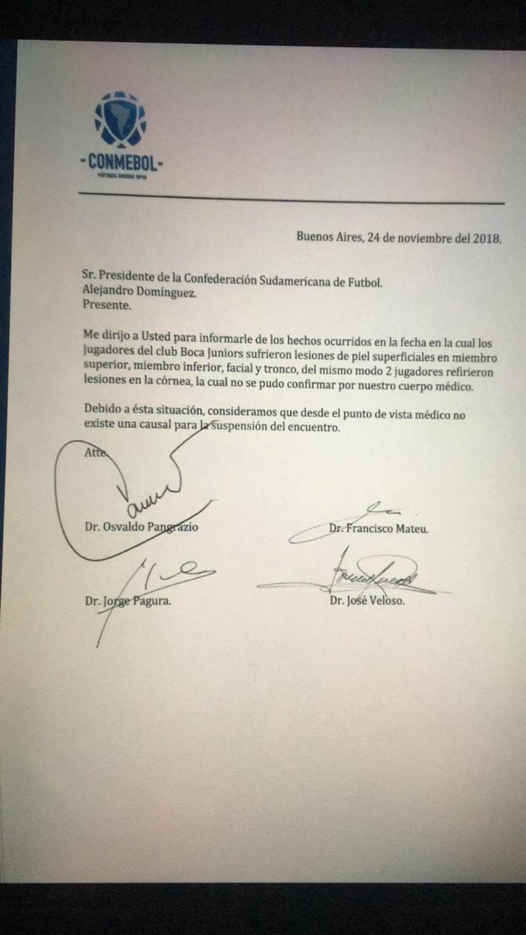 Más temprano, una fuerte polémica se originó por el estado de salud de Pérez. Los facultativos de la Conmebol que asistieron al volante "xeneize" aseguraron que no constataron lesión que impida su participación en el encuentro.