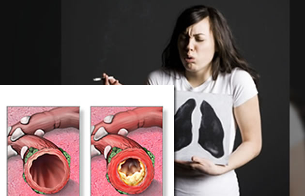 Es una inflamación del tejido que recubre los bronquios, se inflaman y se llenan de mucosidad que bloquea las vías aéreas, produciendo una tos persistente (tos del fumador), dificultad para respirar y una sensación de opresión en el pecho. También está tos , puede ser el aviso de alerta, que está padeciendo una EPOC (Enfermedad Pulmonar Obstructiva crónica)