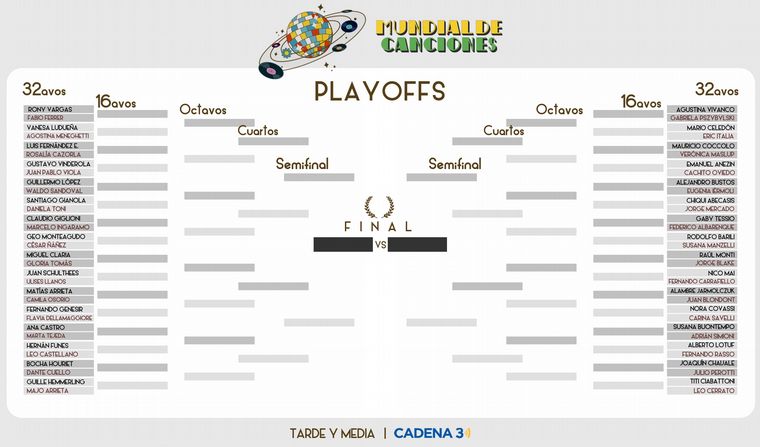 Finalizada la etapa de grupos, ahora empiezan los playoffs de eliminación directa. 64 trabajadores de Cadena 3 competirán cada domingo en Tarde y Media para determinar cuál es la mejor canción.