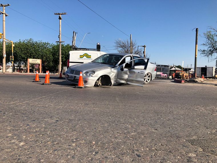 Por circunstancias que se tratan de establecer, un automóvil Mercedes Benz y un taxi Renault Logan impactaron de lleno sobre la avenida.