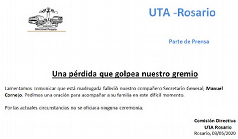 “Lamentamos comunicar que esta madrugada falleció nuestro compañero Secretario General, Manuel Cornejo. Pedimos una oración para acompañar a la familia en este difícil momento”, expresaron desde UTA Rosario.
