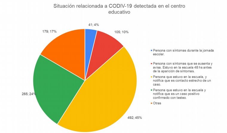 Solo un 45% se notificó que un integrante de la comunidad educativa era contacto estrecho de un caso de Covid-19; en el 10%, una persona con síntomas (48 horas antes de que aparecieran estuvo en la escuela), que se ausenta y avisa. En el 24%, se notificó un caso positivo confirmado.
