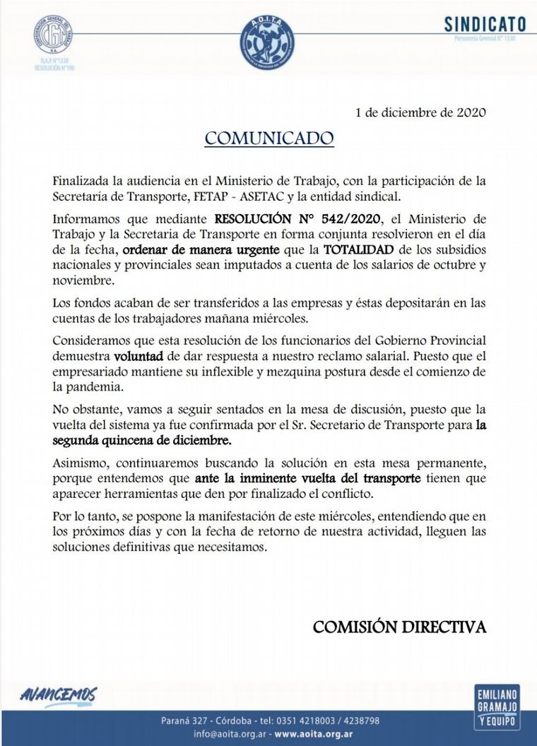Tras una reunión realizada este martes en el Ministerio de Trabajo de la Provincia, el sindicato Aoita dio a conocer, a través de un comunicado, que esa cartera y la Secretaría de Transporte ordenaron, de manera urgente, “imputar la totalidad de los subsidios nacionales y provinciales a cuenta de los salarios de octubre y noviembre”.