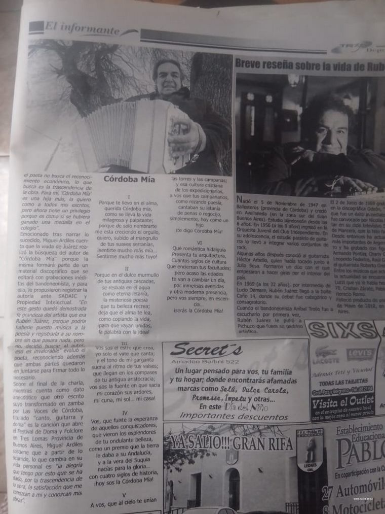 Se trata de "Córdoba mía", cuya letra se la acercaron una vez en un hotel al bandoneonista y cantautor cordobés. Años atrás, en un programa de Cadena 3 se reveló quién había compuesto los versos. Escuchá.