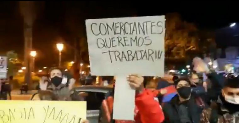Los comerciantes riojanos salieron a protestar este viernes frente a la casa de Gobierno de la capital provincial tras la adhesión del gobernador Ricardo Quintela a las medidas dispuestas por el Presidente.