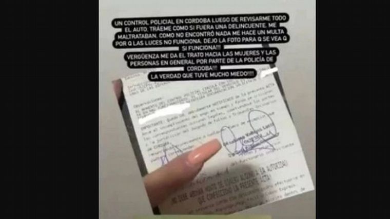 La joven contó que volvía a su casa, ubicada en un country cerca de Carlos Paz, cuando se topó con un control vehicular y la multaron. "Estaba todo en regla, las luces funcionaban", relató.
