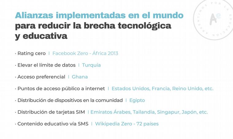 Es así que proponen algunos paliativos, como que el Estado acuerde con operadores de internet un "rating cero" para que ciertas páginas de contenido educativo sean totalmente gratuitas para computadoras o móviles.