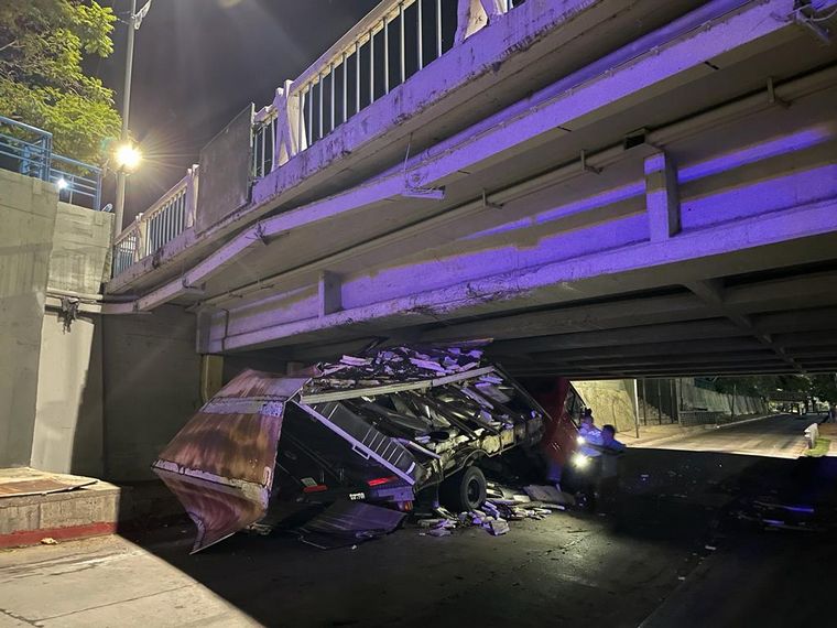 El hecho se produjo en la parte de abajo del puente Sarmiento, cuando el conductor del rorado de gran porte no calculó bien la altura de la caja y la misma se incrustó en la estructura de cemento.