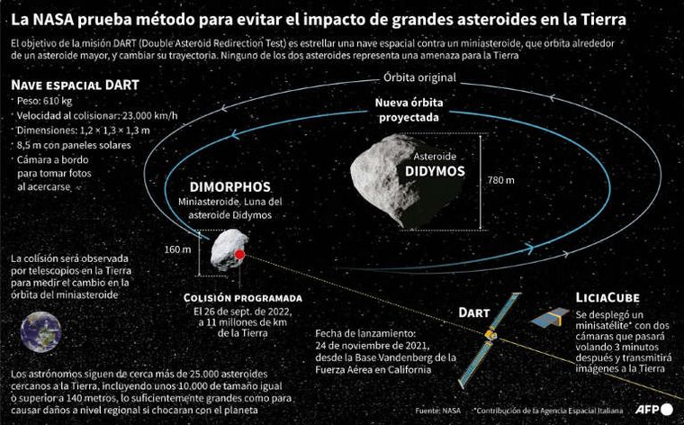 Tres minutos después, un satélite del tamaño de una caja de zapatos, llamado LICIACube y lanzado por DART hace unos días, pasará a unos 55 kilómetros del asteroide para capturar imágenes de la colisión, que serán enviadas a la Tierra en las próximas semanas y meses.
