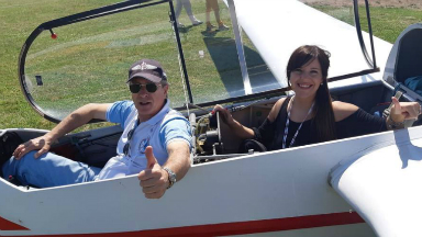 La periodista Eugenia Iérmoli se animó a planear en este encuentro que convoca a los amantes de los aviones y mejores pilotos del país. Mirá el video.