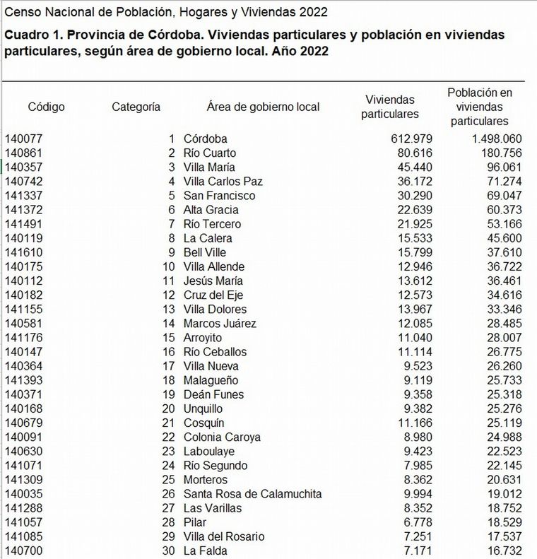 Censo 2022: ¿cuáles son las ciudades más grandes de Córdoba?