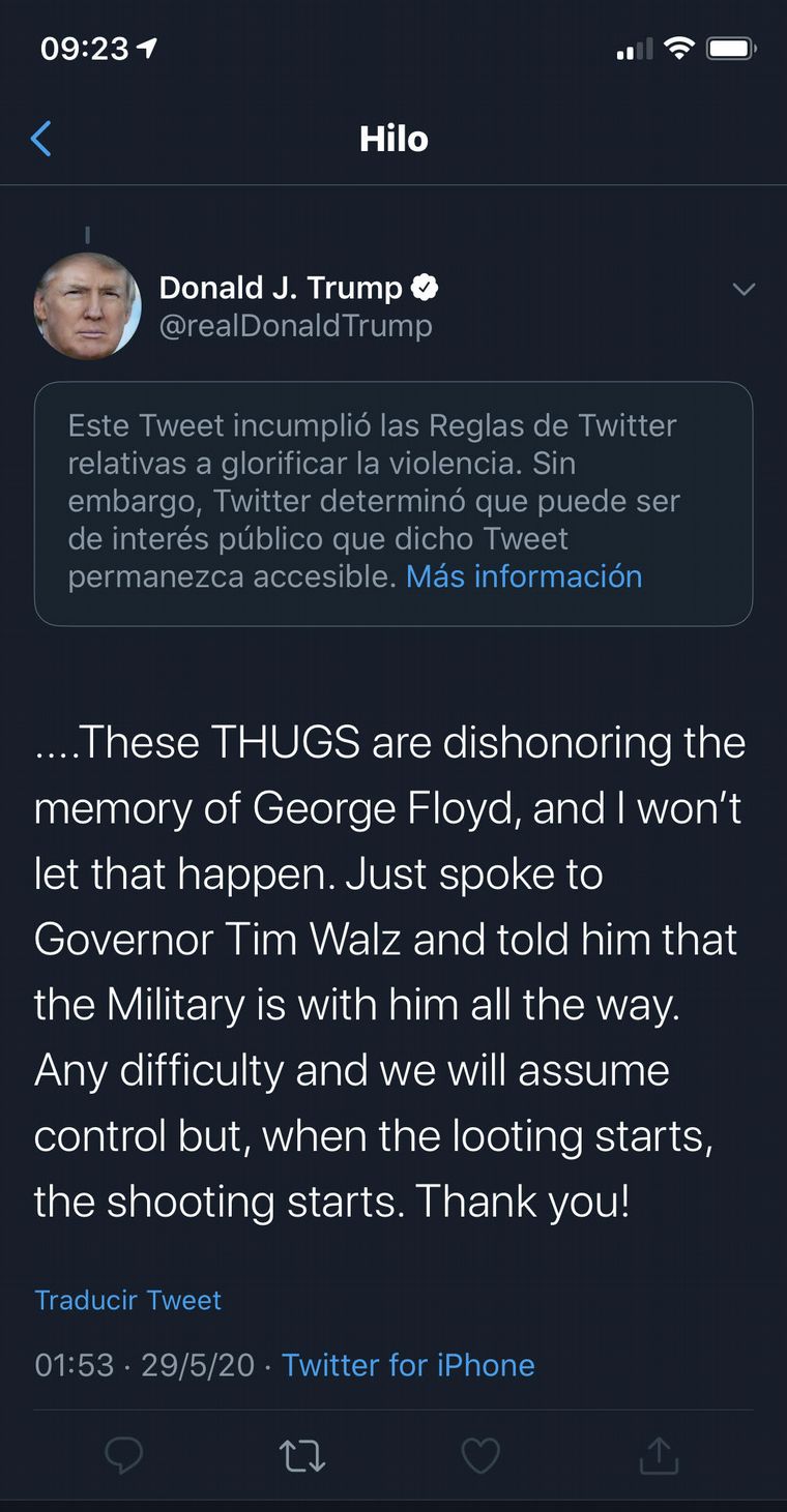 "Este tuit incumplió las reglas de Twitter relativas a glorificar la violencia. Sin embargo, Twitter determinó que puede ser de interés público que dicho tuit permanezca accesible", dijo la red social en un mensaje publicado sobre el mensaje de Trump.