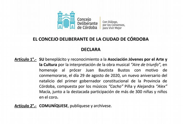 Por su parte, el Concejo Deliberante de la ciudad de Córdoba decretó este sábado un reconocimiento a la Asociación Jóvenes por el Arte y la Cultura por la interpretación de la obra.