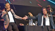 Palito (77 años), de pantalón tipo jean, remera blanca y saco gris fue el más movedizo y arengador del show, yendo de acá para allá y ensayando pasos de baile, mientras que Cacho (75), de clásico traje y camisa negros con bufanda blanca, estuvo sentado a lo largo de la presentación.