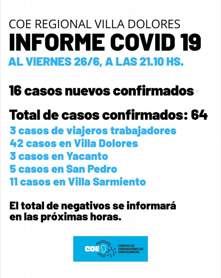 Se trata de 16 personas contagiadas: cuatro en Villa Dolores, dos en San Pedro y diez en Villa Sarmiento. La zona se encuentra en fase 1 hasta el 2 de julio.