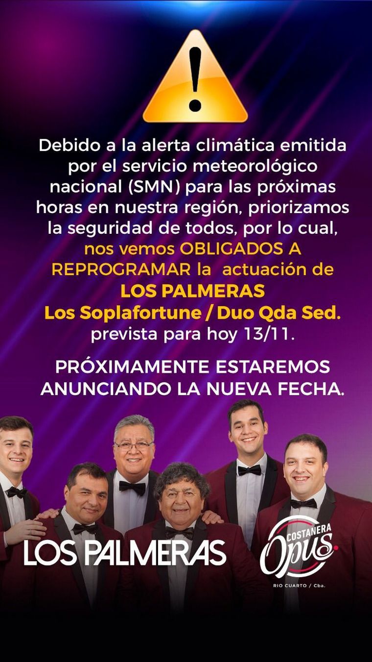 Audio. Suspenden el show de Los Palmeras por alertas de tormentas en Río Cuarto
