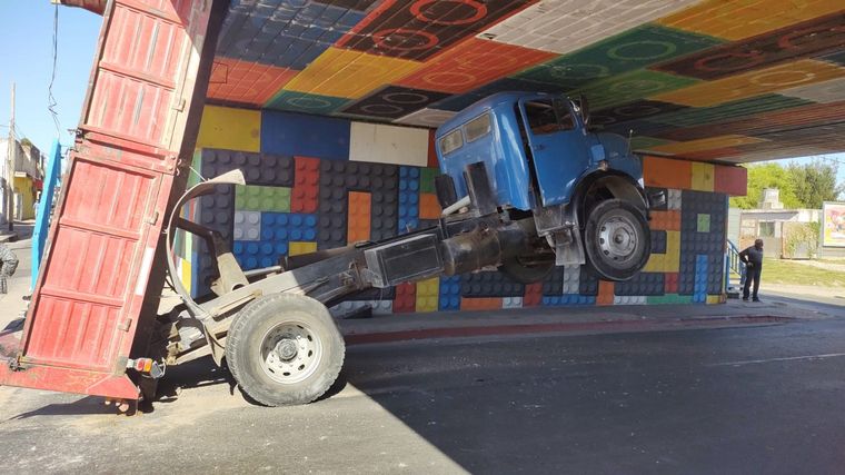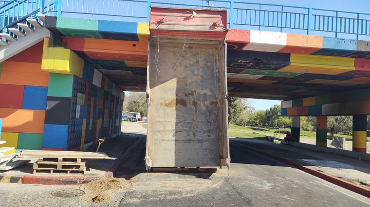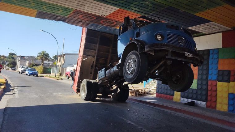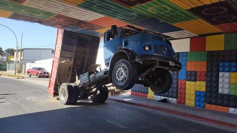 Un camión perteneciente a un corralón, circulaba por Avenida Costanera, en la Ciudad de Córdoba, cuando por un desperfecto mecánico se le levantó la caja volcadora y quedó atrapado debajo del puente Zípoli.