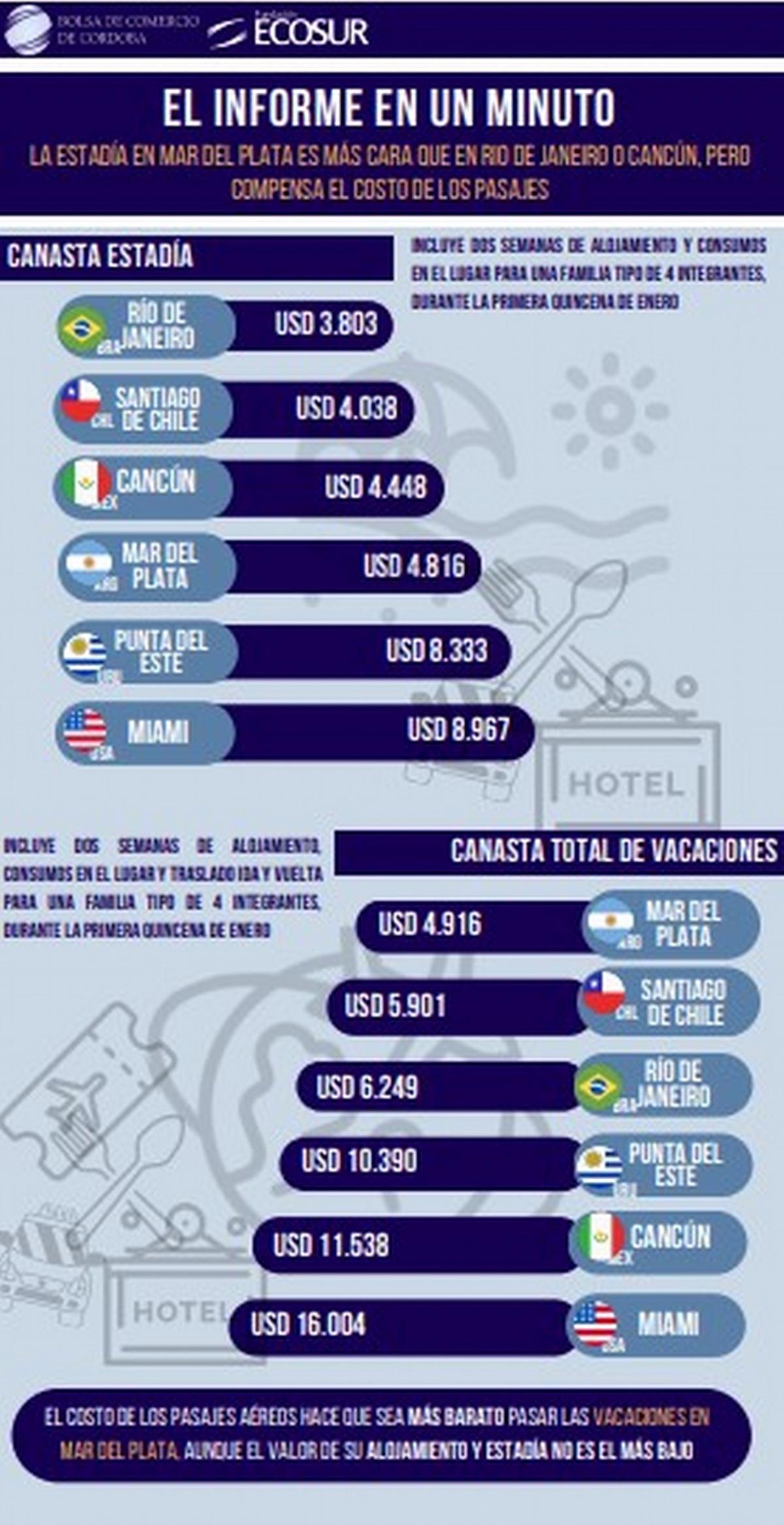El informe analizó el costo para cuatro personas que vacacionan durante dos semanas en enero en Mar del Plata, Río de Janeiro, Punta del Este, Santiago de Chile, Cancún y Miami.