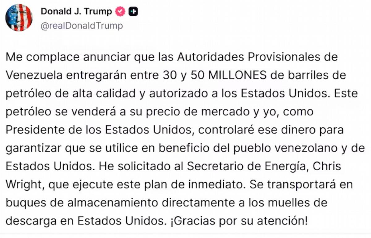 “Me complace anunciar que las autoridades provisionales de Venezuela entregarán entre 30 y 50 millones de barriles de petróleo de alta calidad y autorizado a los Estados Unidos”, expresó Trump en la plataforma The Truth Social.