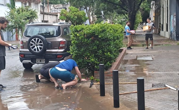 Desde el municipio recuerdan medidas preventivas para evitar accidentes o anegamientos por la caída abundante de agua, eventos eléctricos y vientos fuertes. Vecinos trabajan en la vía pública.
