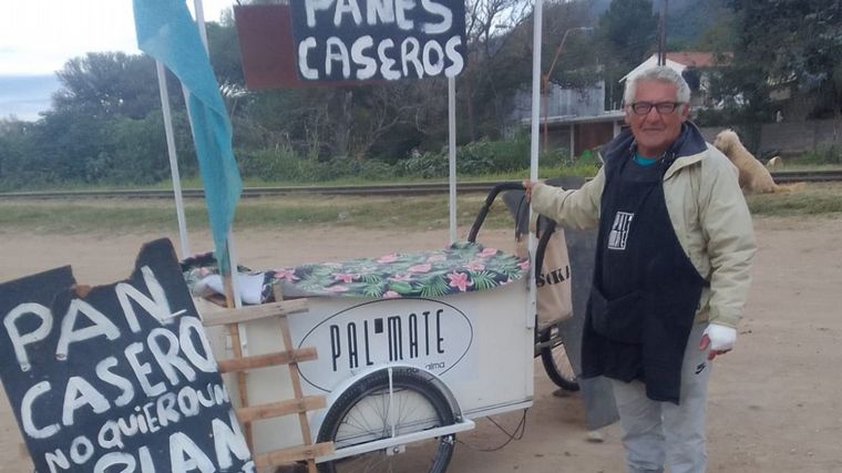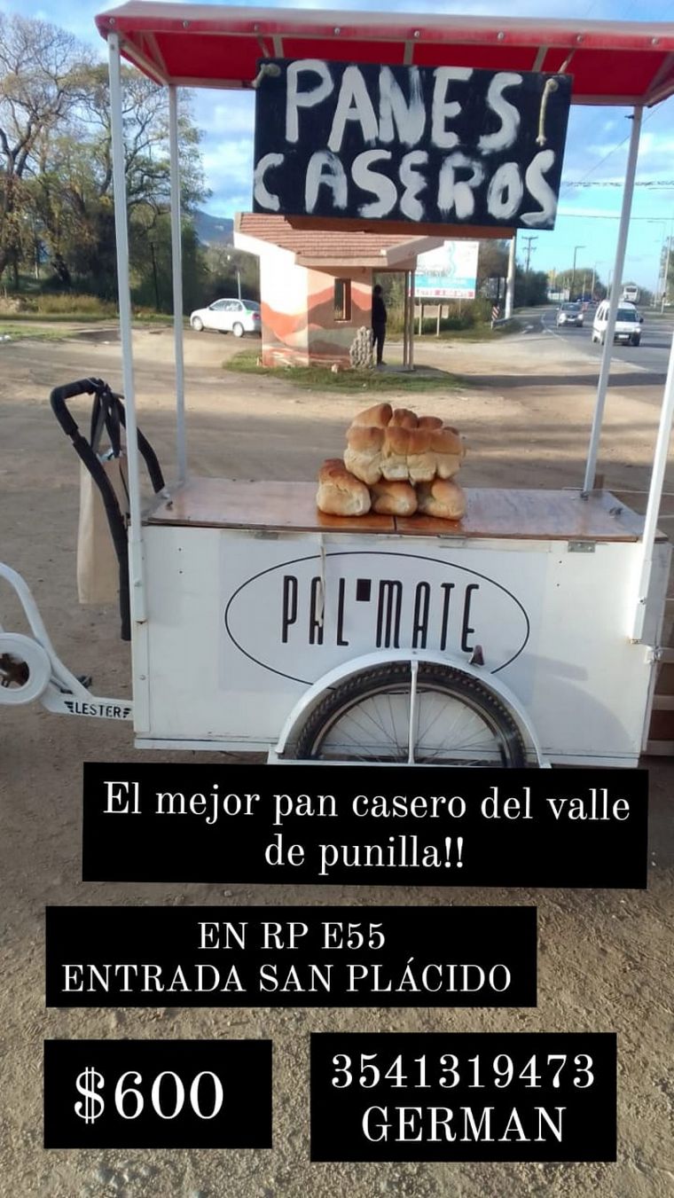 Germán Schvab, es vendedor de pan, tiene 65 años y vende pan casero con un carrito ambulante en la ruta E55, en la entrada de San Plácido, antes del ingreso de Bialet Masse, todos los días de 7 a 19.