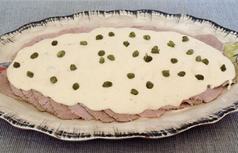 Cortar en rodajas bien finas el peceto o la lengua, lo cubrimos con la salsa y podemos decorar con alcaparras y la yema dura picada.
