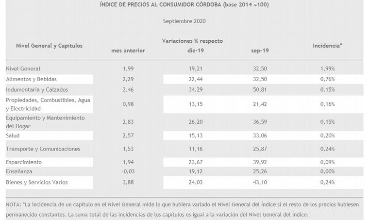 Córdoba registró una inflación del 1,99% en septiembre