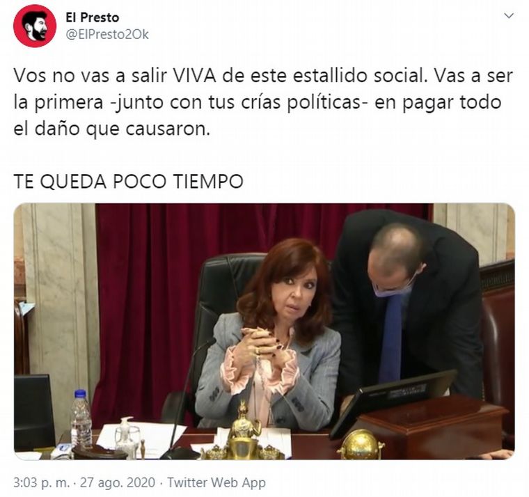 Está acusado de "amenazas" e "incitación al odio y la violencia" a raíz de un tuit en contra de la ex Presidenta.