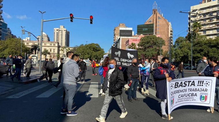 Propietarios de canchas de fútbol y profesores de patín, danza, vóley y otras actividades deportivas reclamaron este miércoles al mediodía frente al Patio Olmos de Córdoba para que se les permita volver a trabajar, en el marco de las restricciones por la pandemia de coronavirus.