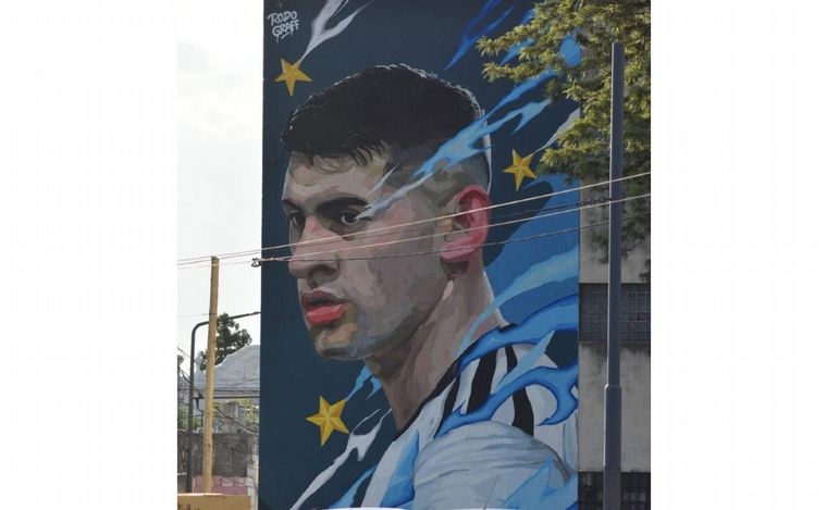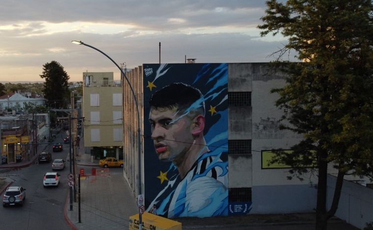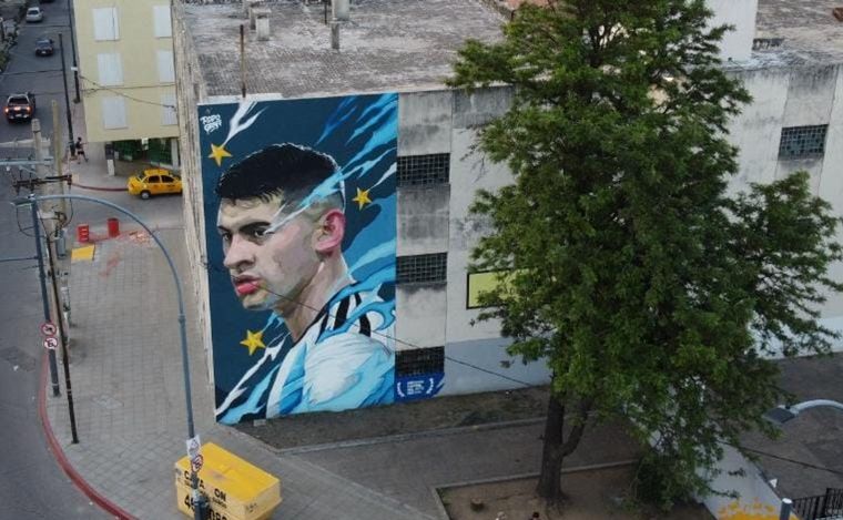 El artista Rodo Graff dibujó el rostro del defensor argentino Cristian "Cuti" Romero en un mural de Plaza de las Américas, en Córdoba, tras la consagración en el Mundial de Qatar.