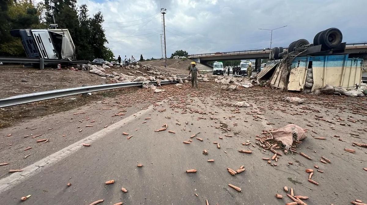El accidente ocurrió aproximadamente a las 15 horas en el punto de unión de ambas arterias. La parte delantera del camión quedó tendida sobre el asfalto, mientras que el acoplado, cargado con bolsas de zanahorias, rodó hacia abajo y bloqueó el acceso este.