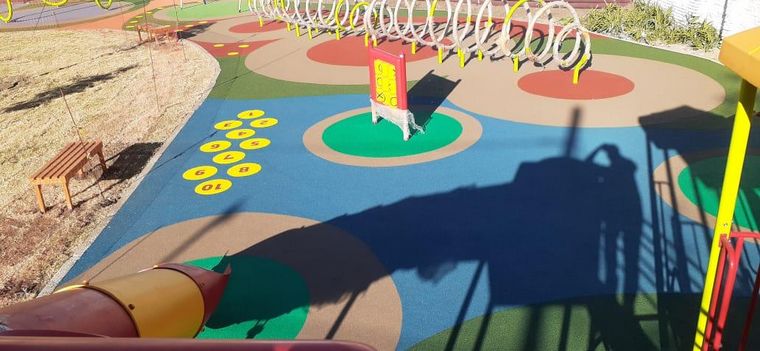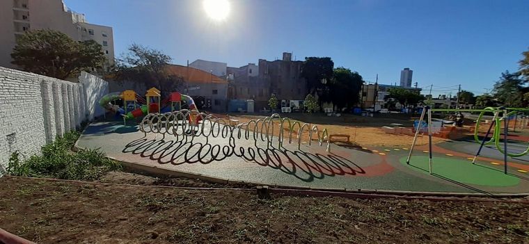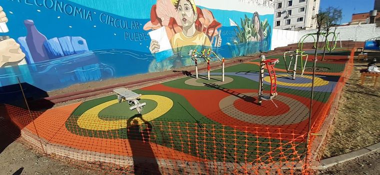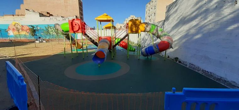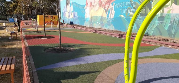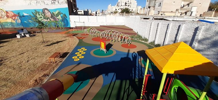 La superficie está hecha de caucho para evitar que los niños sufran fuertes golpes. También tiene juegos y mural. Mirá las fotos.