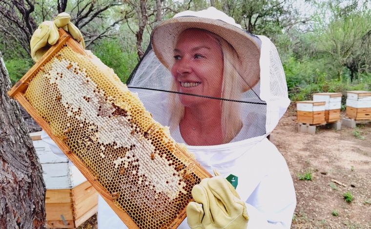 La cronista de Cadena 3 Celeste Benecchi se arremangó y se calzó el traje de apicultora para hacer el trabajo. Es una tarea que pueden disfrutarla los turistas en la localidad cordobesa.