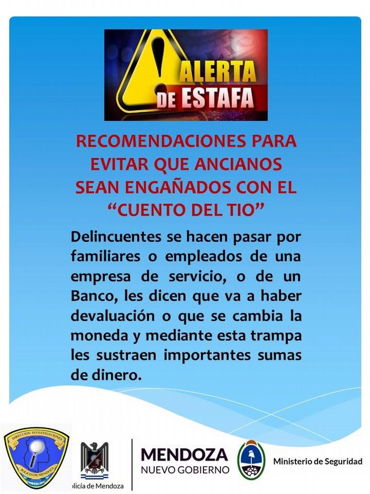 Ante la reiteración de estos hechos, desde la Policía advirtieron que es necesario explicarle a los adultos mayores que no deben brindar datos por teléfono y sobre todo nunca dejar entrar a un desconocido a la casa.