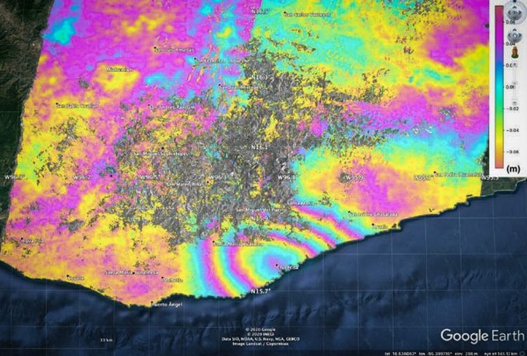 Cada ciclo define aproximadamente 15 centímetros de desplazamientos en la dirección de línea de visión del satélite y, según el reporte, el desplazamiento fue de casi medio metro en la zona del epicentro del terremoto.