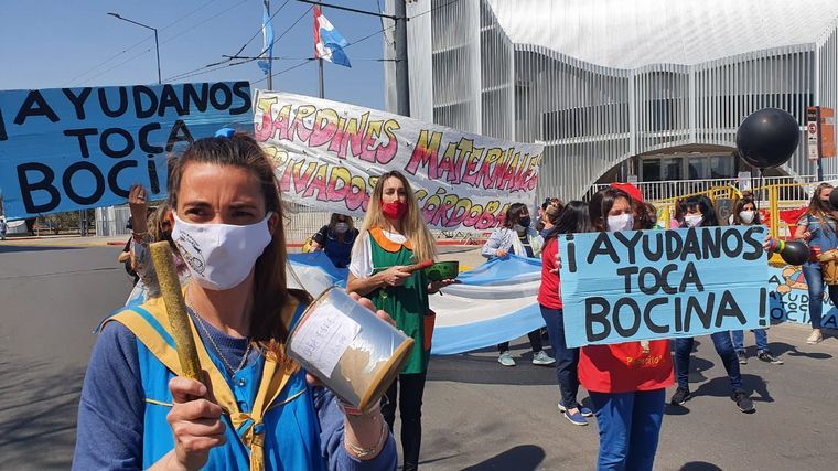 Representantes de jardines maternales de la provincia de Córdoba se concentraron este miércoles frente a la Legislatura para reclamar subsidios al Gobierno provincial, debido a la imposibilidad de trabajar por la pandemia de coronavirus.