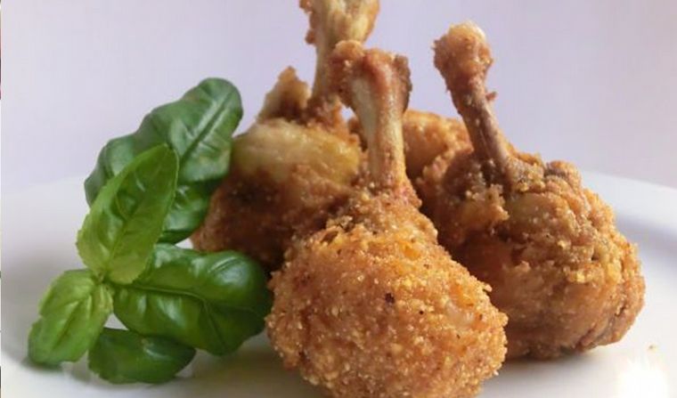 Separar el “muslito” que trae la alita. Cuando tenga todos los muslitos listos, frotar con mostaza y marinar por una o dos horas en una mezcla de huevo revuelto con un chorrito de leche sal y pimienta.