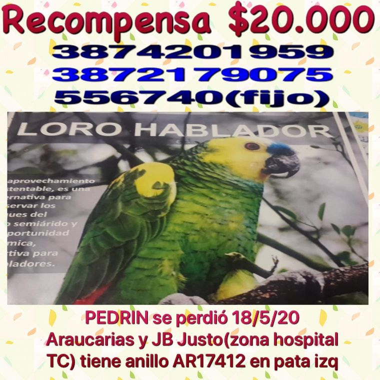 Dispuso de tres números telefónicos para quienes aporten datos de su loro, que se adjuntan en la imagen de abajo.