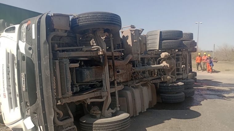 Un camión que transportaba hormigón elaborado tumbó sobre su lado derecho en la ruta 19 a la altura de la rotonda de la avenida Piero Astori, en el giro de ingreso a la fábrica de ladrillos.