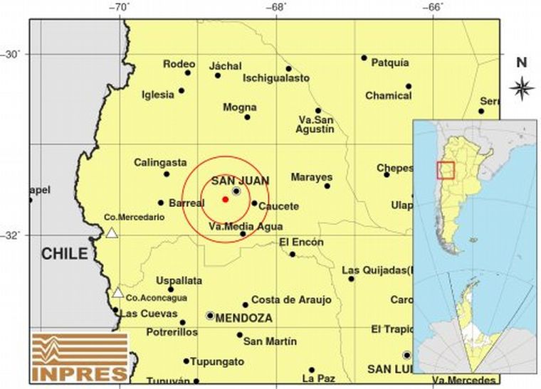 El epicentro se reportó a 19 kilómetros al sudoeste de San Juan, a 137 kilómetros al norte de Mendoza y a 34 kilómetros al oeste de Caucete.
